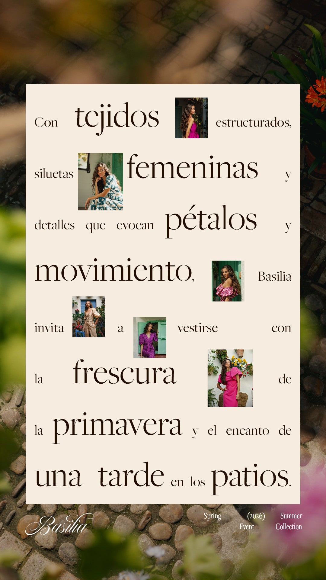 Con tejidos estructurados, siluetas femeninas y detalles que evocan pétalos y movimiento. Basilia invita a vestirse con la frescura de la primavera y el encanto de una tarde en los patios.