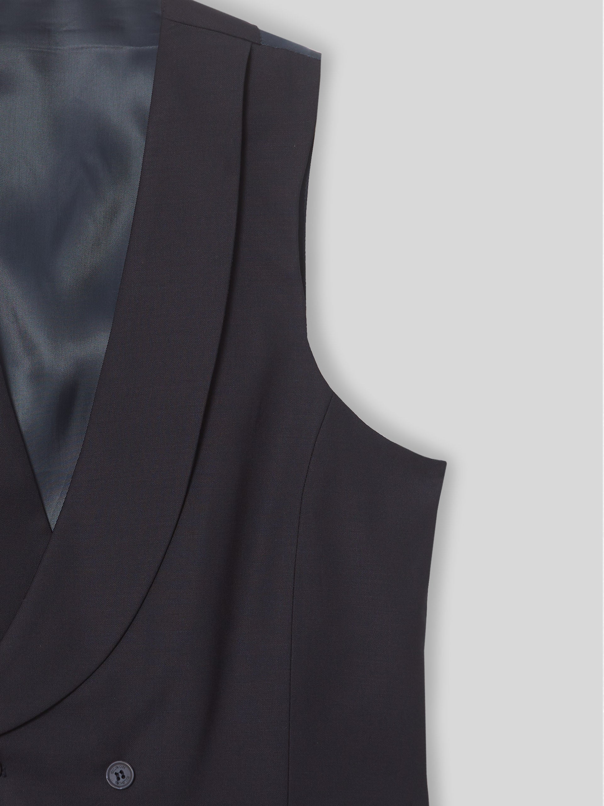 Gilet habillé extensible en 100% laine, coupe classique et doublure bleu marine avec réglage en métal. Ce gilet présente des revers arrondis et une fermeture à double boutonnage ave .