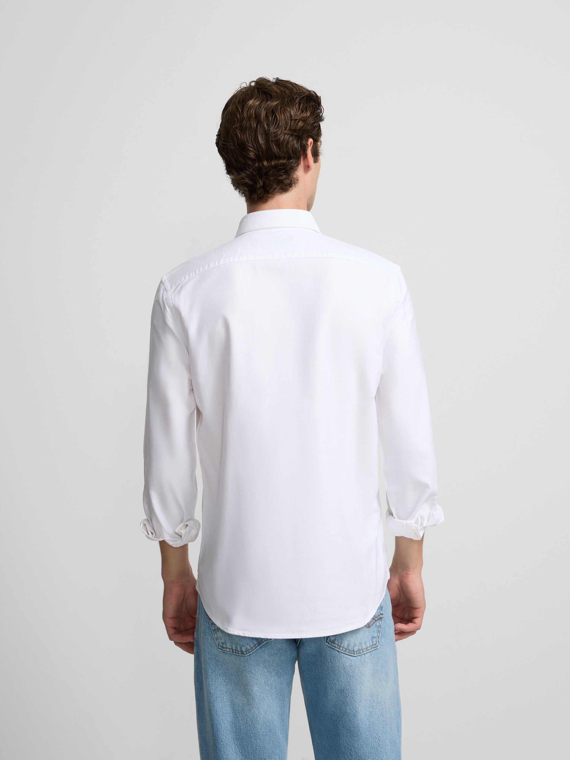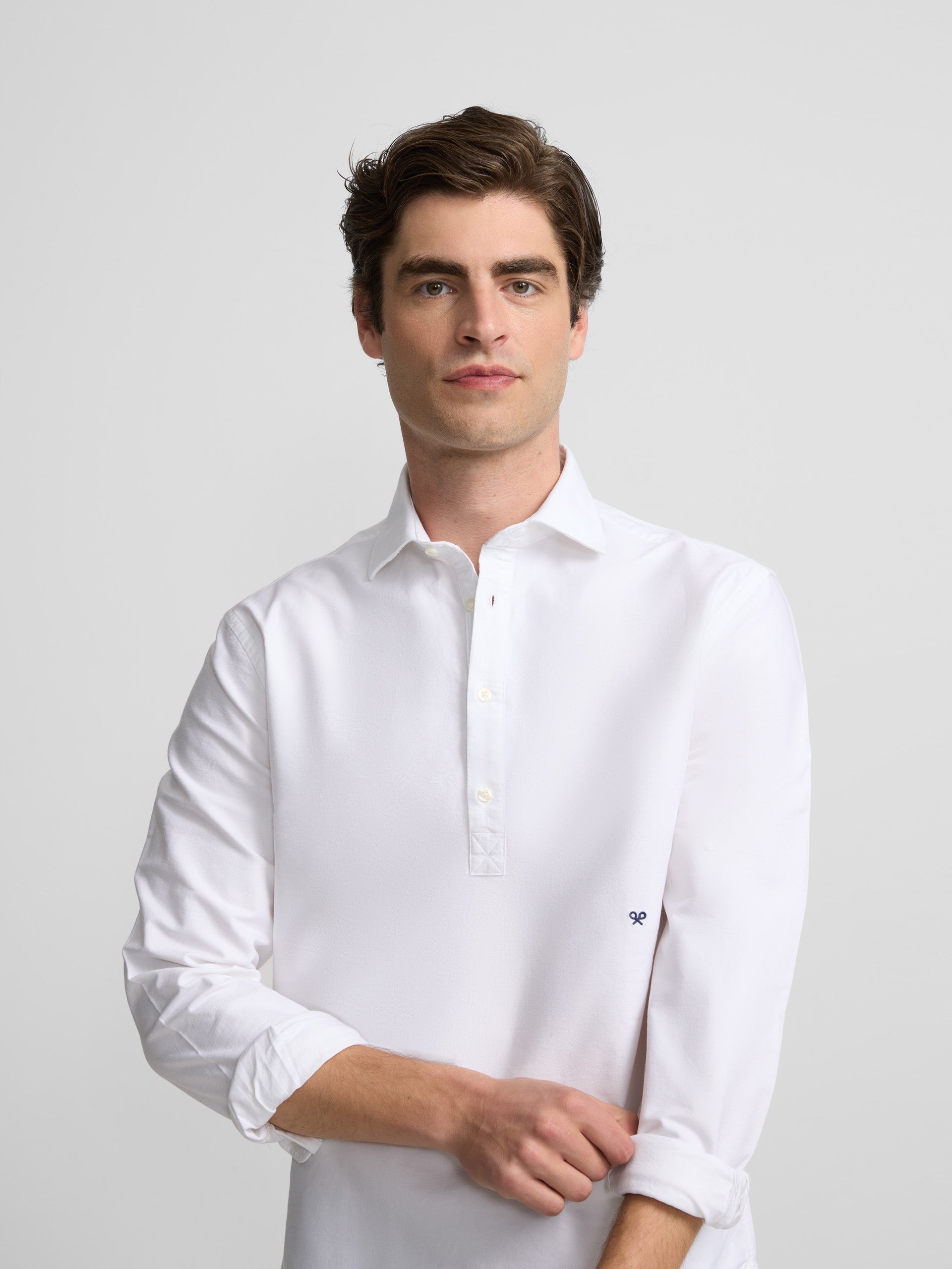 Polera oxford confeccionada en 100% algodón de corte Regular fit. Presenta cuello  cutaway, cierre con botones personalizados y manga larga de puño con botones. Cuenta con raquetas bordadas en el torso.