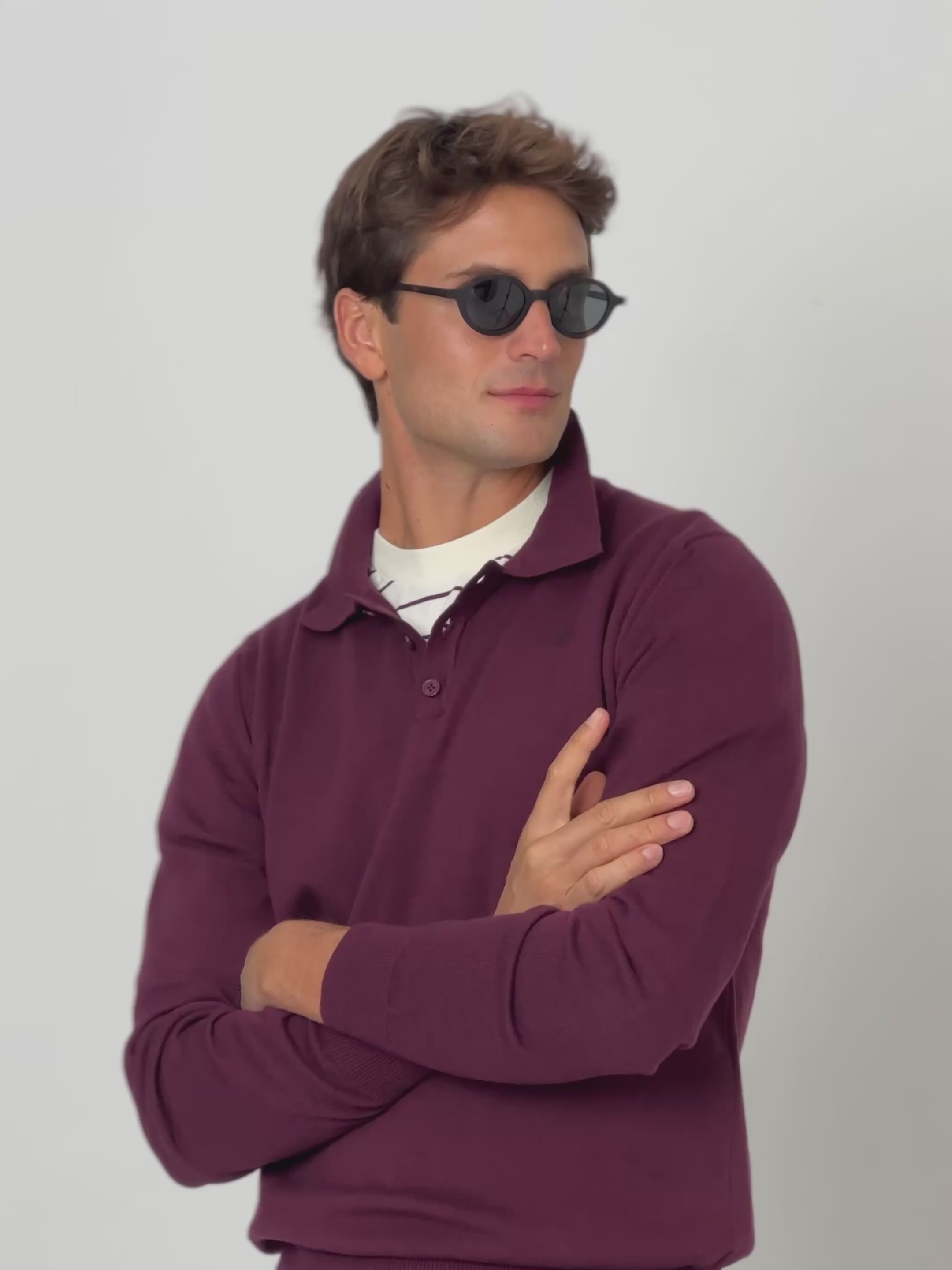 Jersey cuello polo color burdeos confeccionado en mezcla de lana. Presenta cuello clásico con cierre de botones y manga larga con puño elástico. Cuenta con bordado de raquetas en el torso a contraste en color azul marino. Fabricado en Portugal.