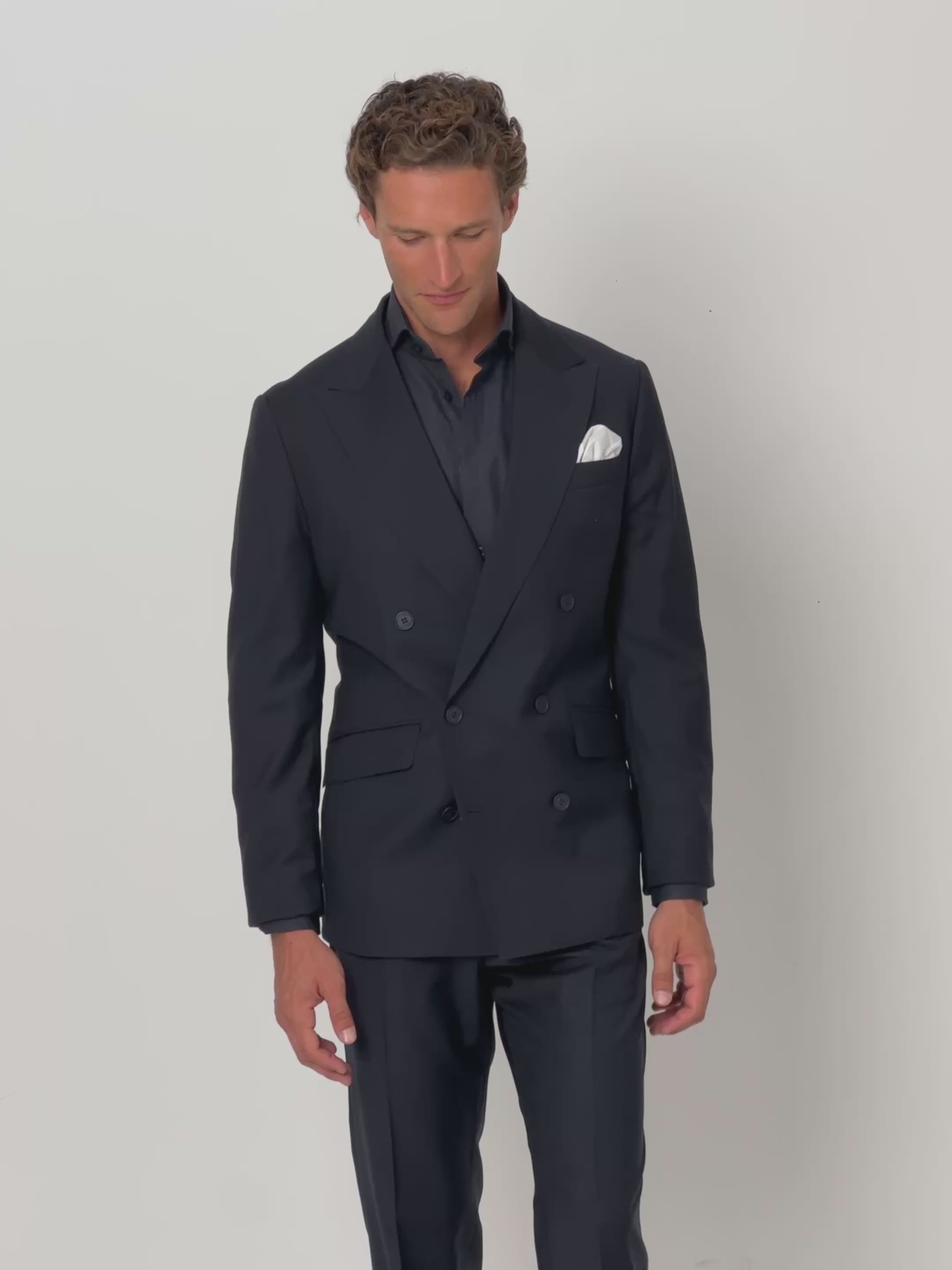 Americana traje cruzado strech navy confeccionada en mezcla de lana y elastano para aportar ligereza y comfort. Presenta patrón Slim fit de corte cruzado de cierre con seis botones personalizados, bolsillos con solapa y bolsillo insertado en pecho. Cuenta con solapas de punta de lanza, forro interior personalizado, hombreras y mangas acabadas con ojales y botones realizables personalizados. Fabricado en Portugal.