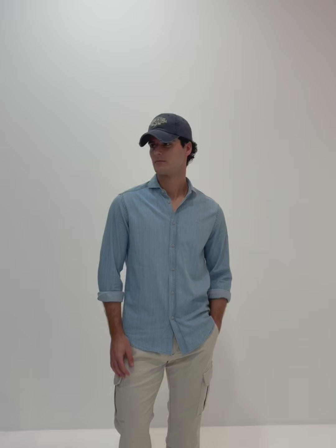 Camisa sport denim azul claro confeccionada en 100% algodón BCI. Presenta cuello cutaway, cierre con botones y manga larga de puño con botones. Cuenta con raquetas bordadas al tono en el torso.