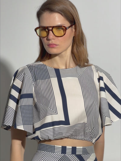 Unique blouse by Woman, made from 100% cotton. Features a white and blue check print. It has short sleeves and a round neck. Made in Spain. Matching skirt available.