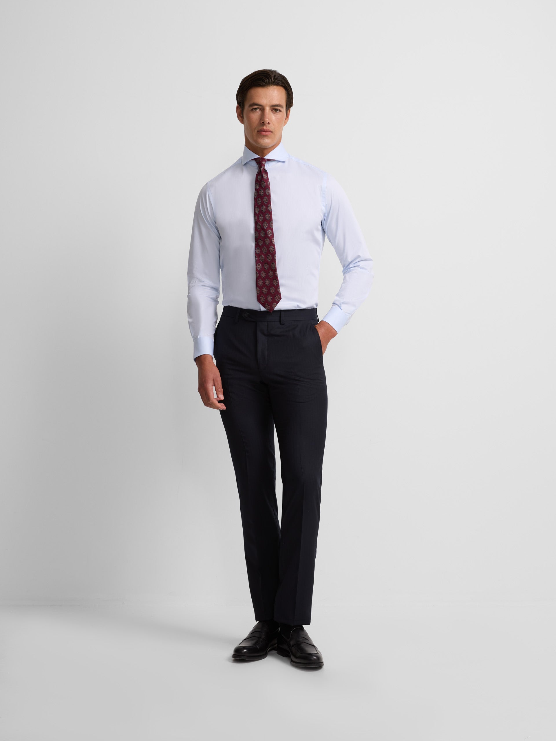 Classic suit pants made of 100% merino wool. It has a classic cut with an extended closure with a personalized button and zipper, side pockets and inserted pockets on the back. It has belt loops and a cuffless hem. Made in Portugal.
