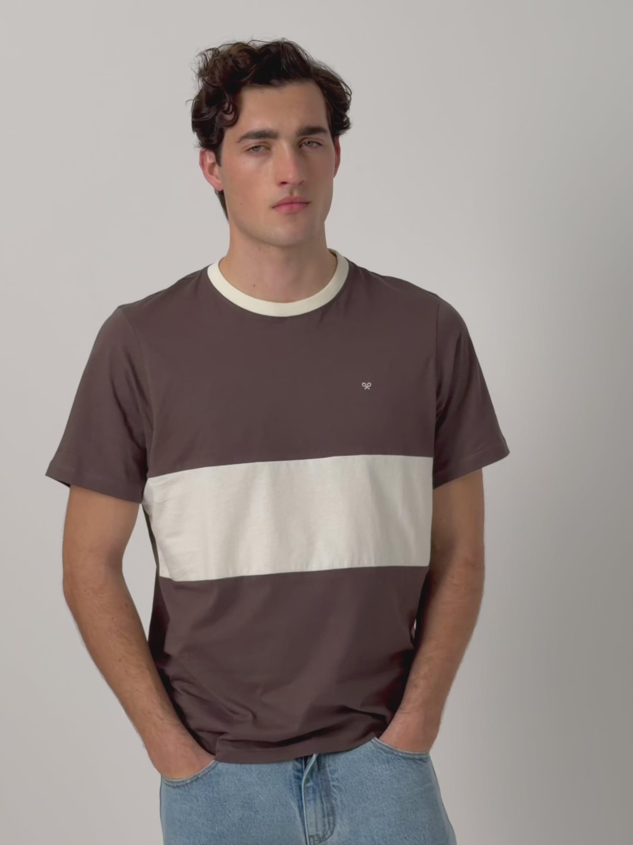 Short-sleeved T-shirt made from 100% cotton with a regular fit. Features a wide horizontal white stripe, a round neck with a white band, and contrasting tennis racket embroidery on the torso. Made in Portugal.