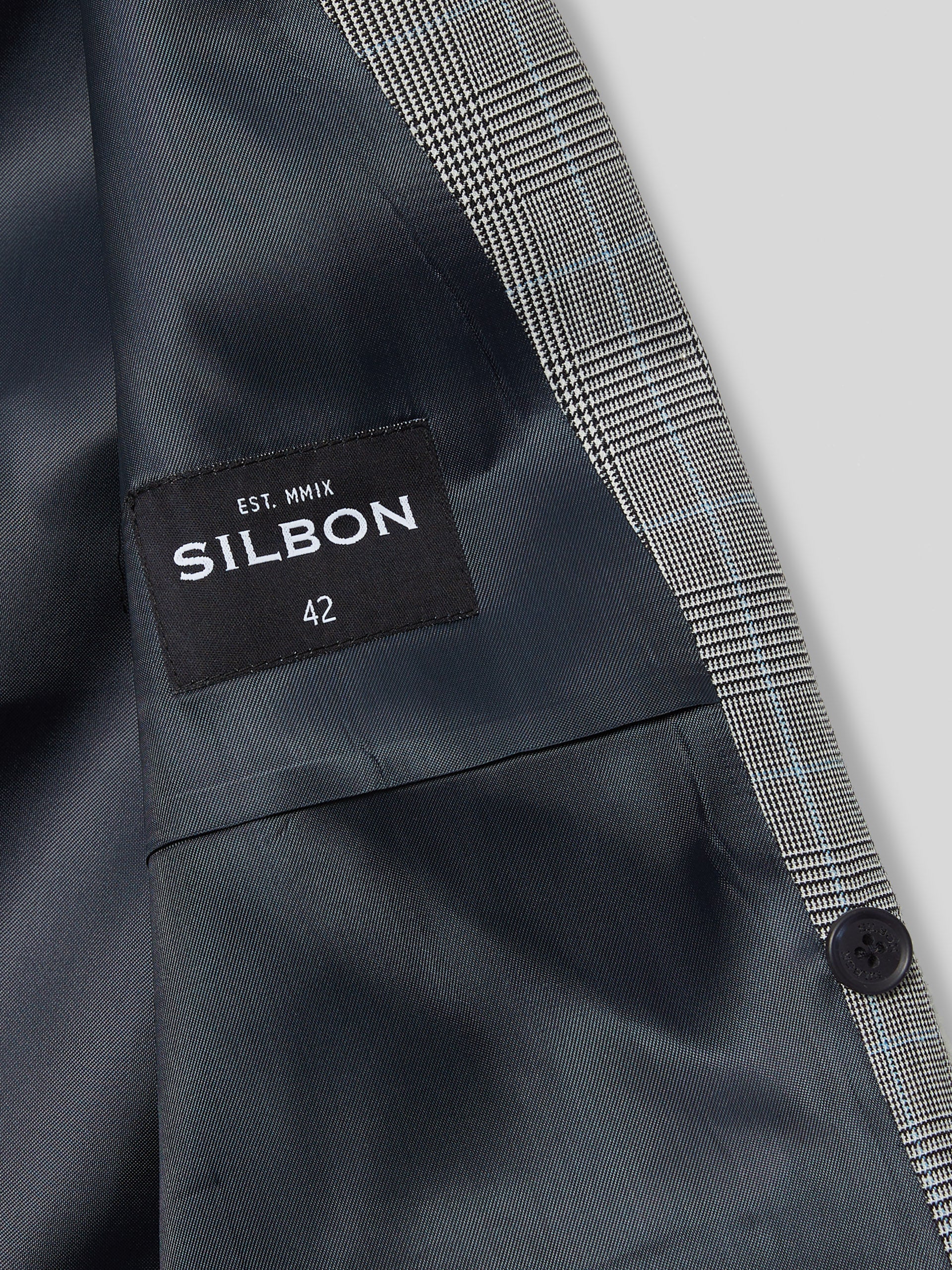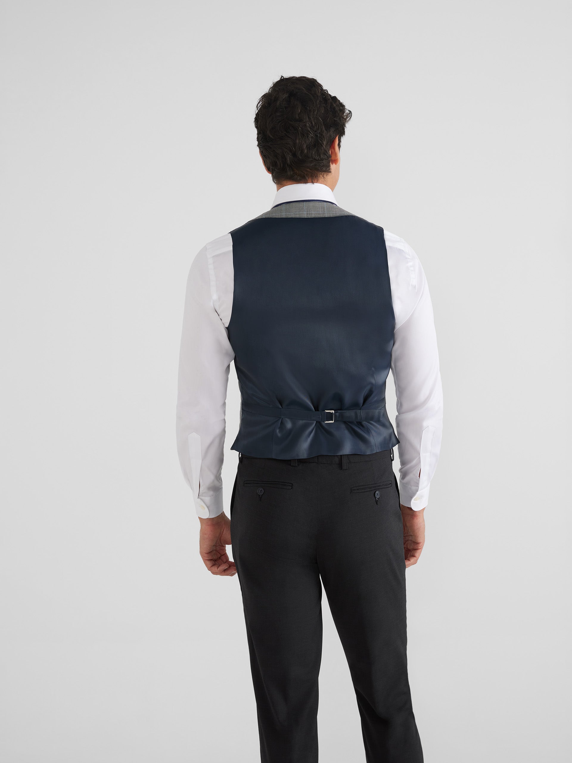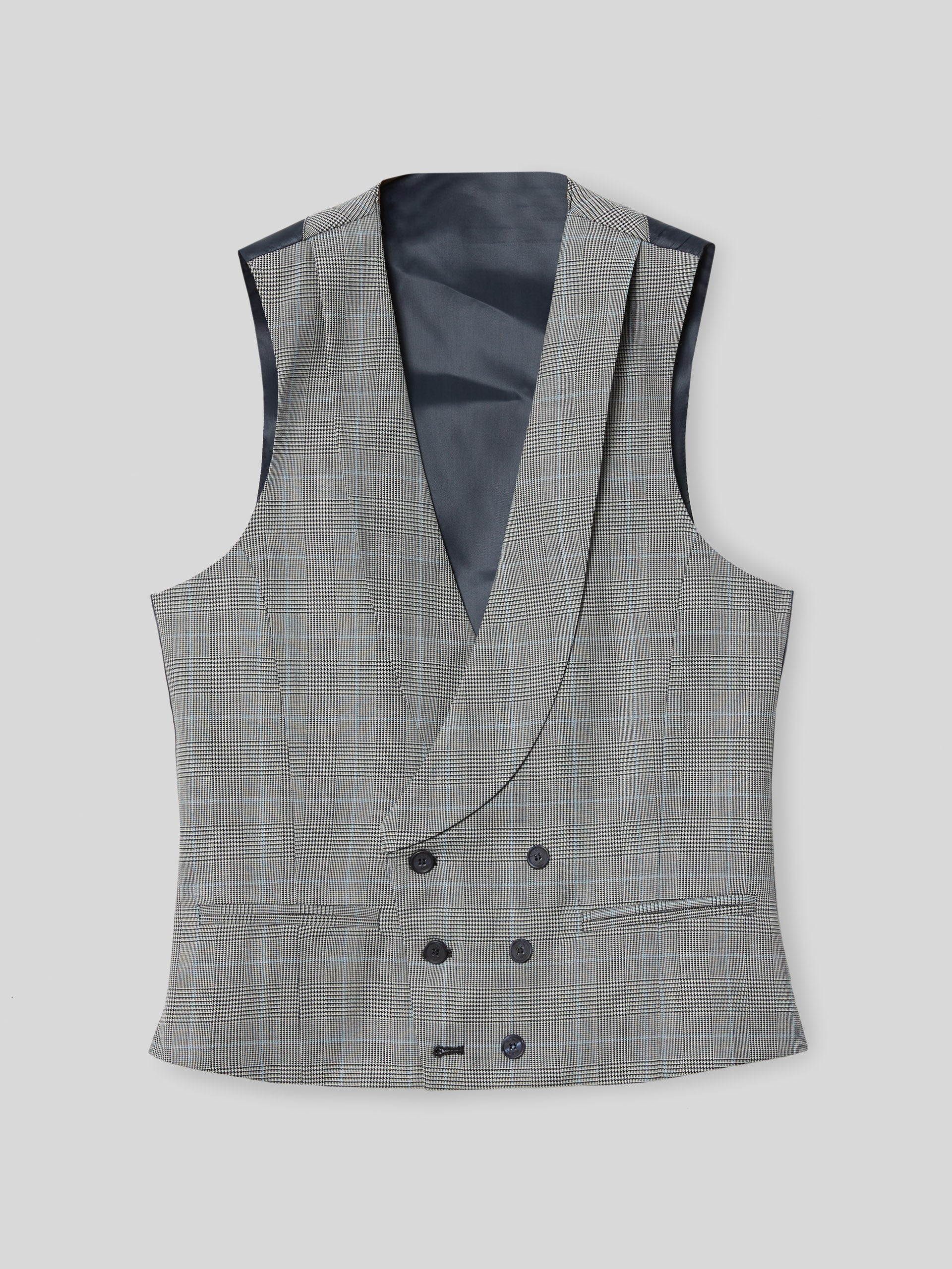 V-neck morning suit vest made of gray Prince of Wales fabric. It has a slim fit with a back adjustment with a buckle, a navy blue satin back, welt side pockets and a double-breasted cr .