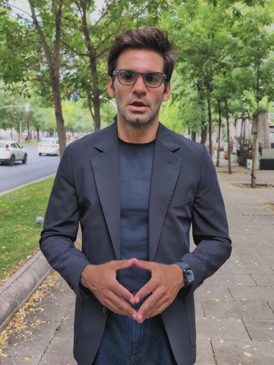 This blazer is crafted from a technical fabric. It features a straight closure with matching custom buttons, front patch pockets, a chest pocket, and sleeves finished with buttonholes and snap buttons. It has a notched lapel collar. The lightweight and comfortable fabric offers excellent freedom of movement and requires no ironing thanks to its wrinkle resistance. Ideal for pairing with both formal and casual outfits, this blazer is a versatile and essential piece for any modern wardrobe.
