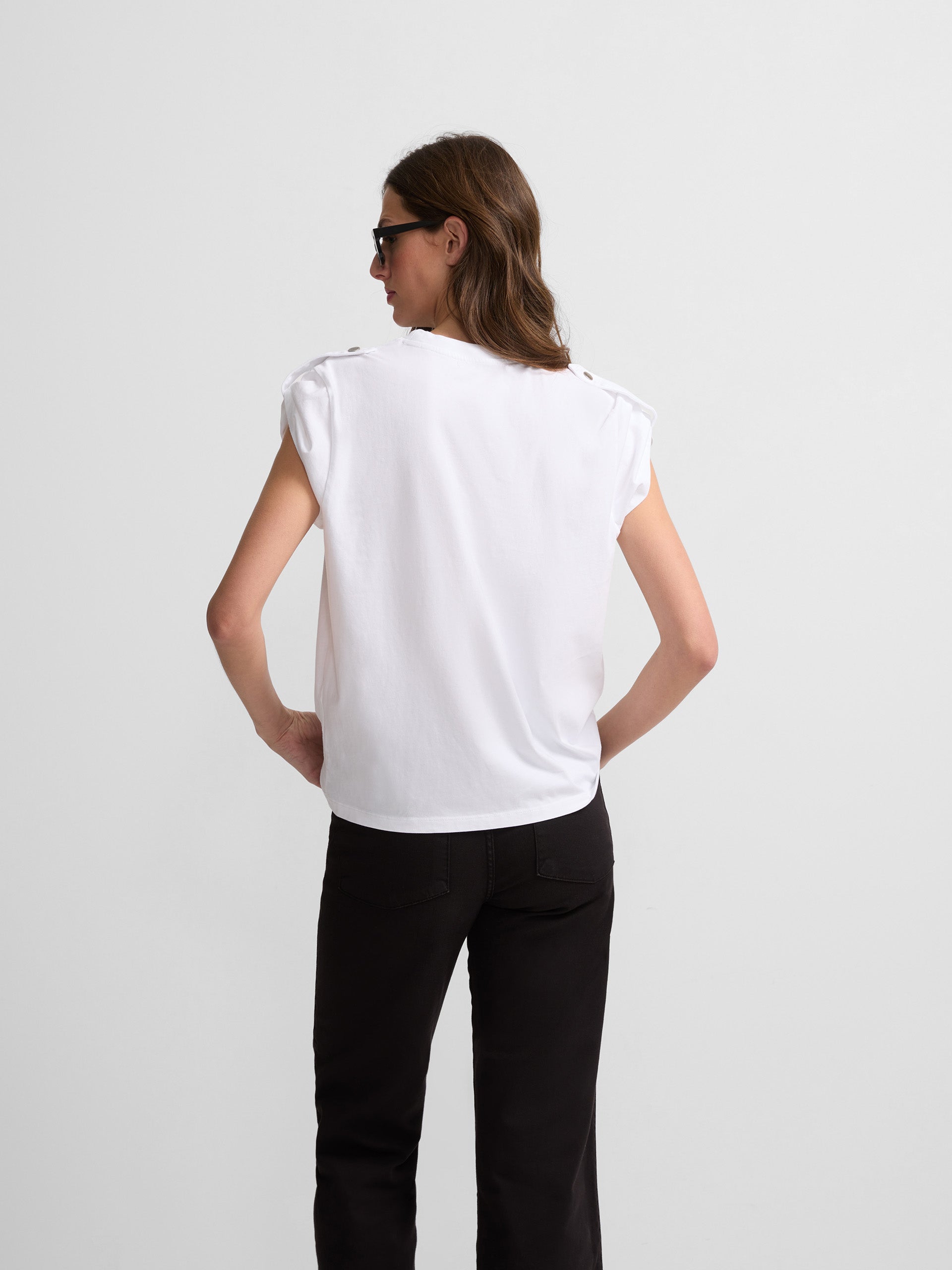 Basic white t-shirt made of 100% cotton with a regular fit, comfortable and versatile. It features a round neckline and roll-up sleeves, with a racket print and lettering on the torso for a distinctive, modern touch. Made in Portugal.
