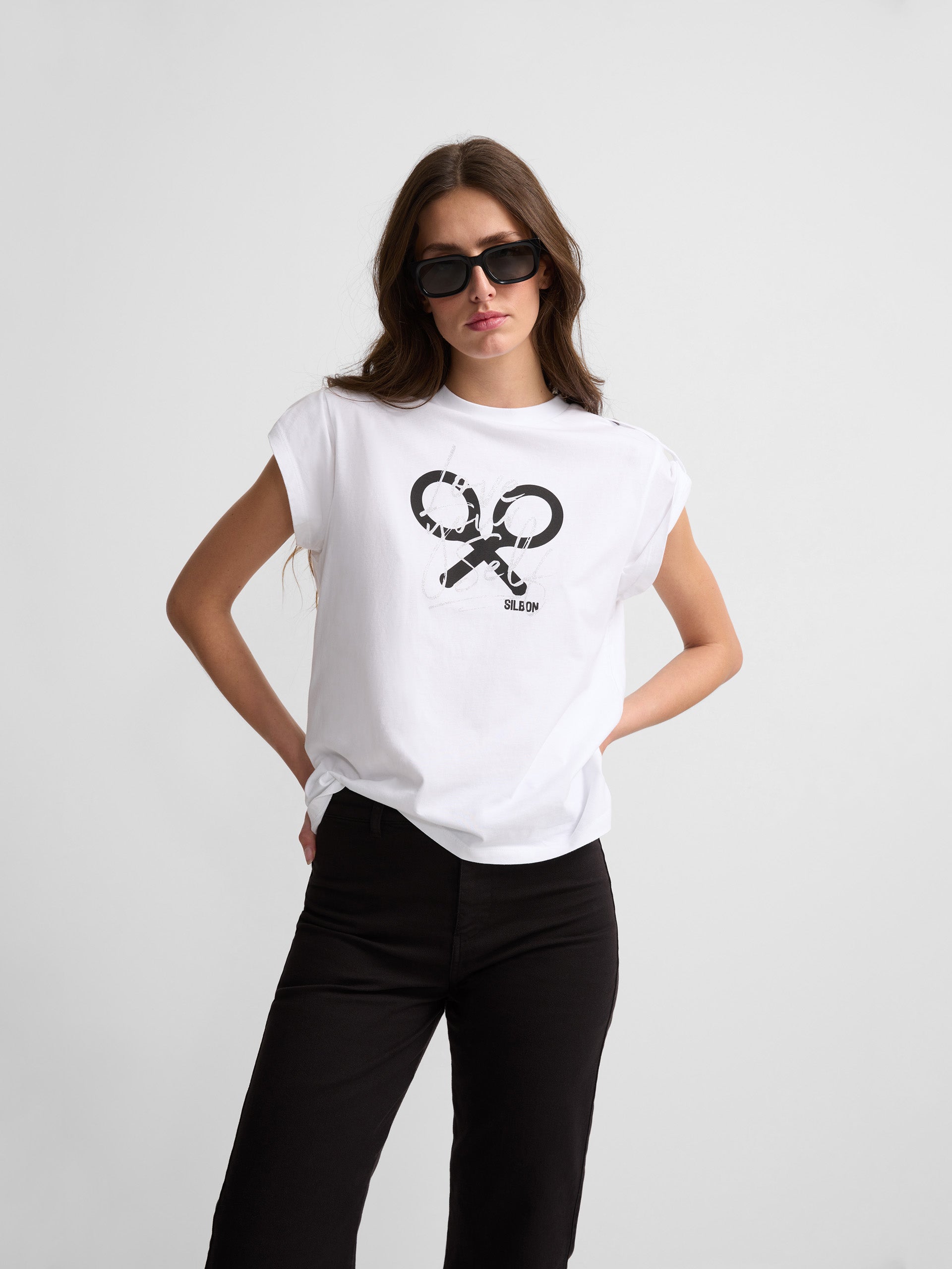 Basic white t-shirt made of 100% cotton with a regular fit, comfortable and versatile. It features a round neckline and roll-up sleeves, with a racket print and lettering on the torso .