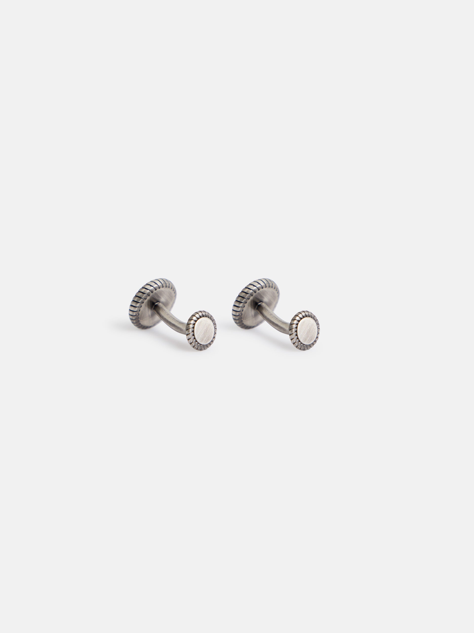 Antique silver-effect brass crown cufflink with racket engraving on the front.