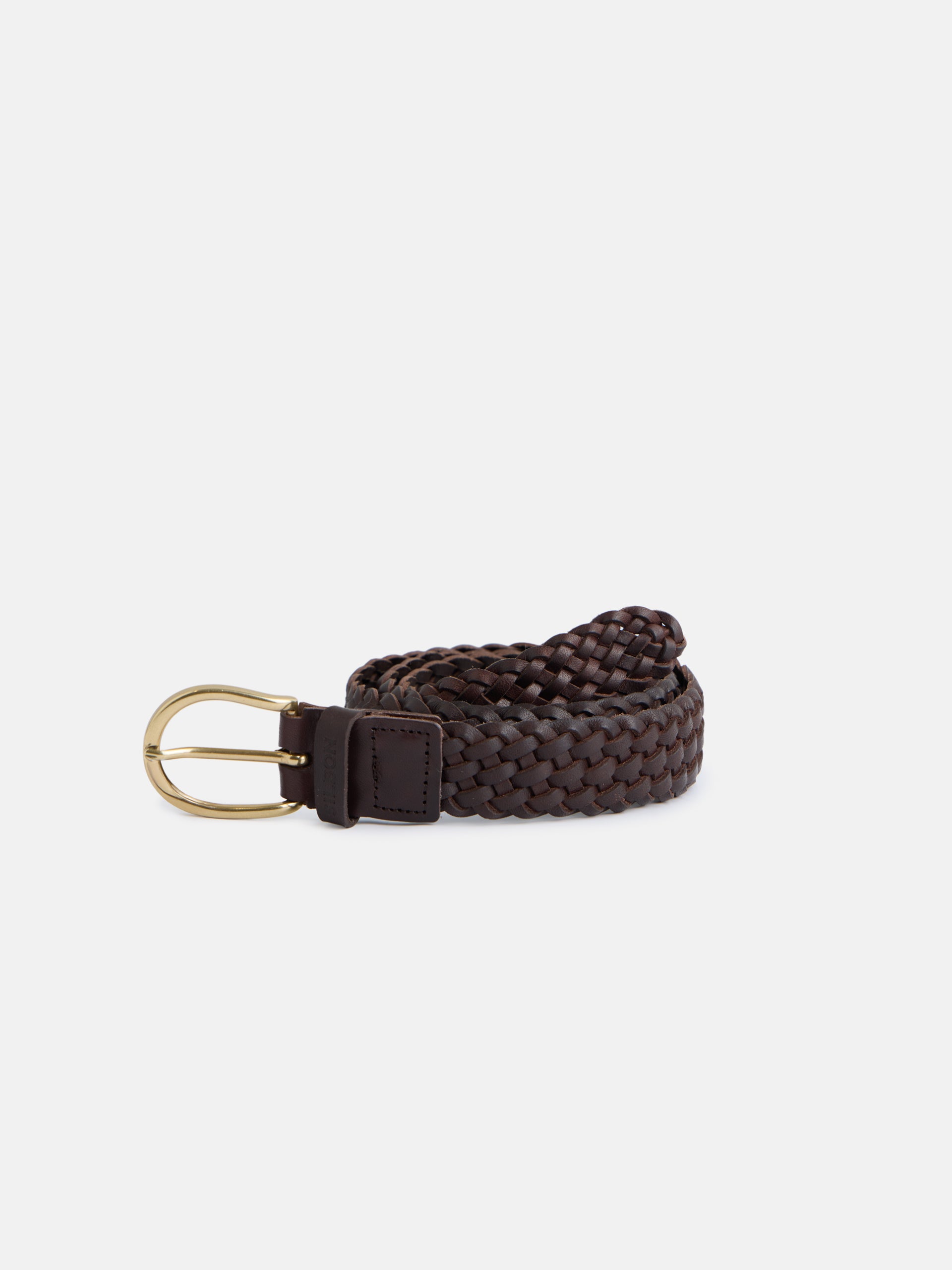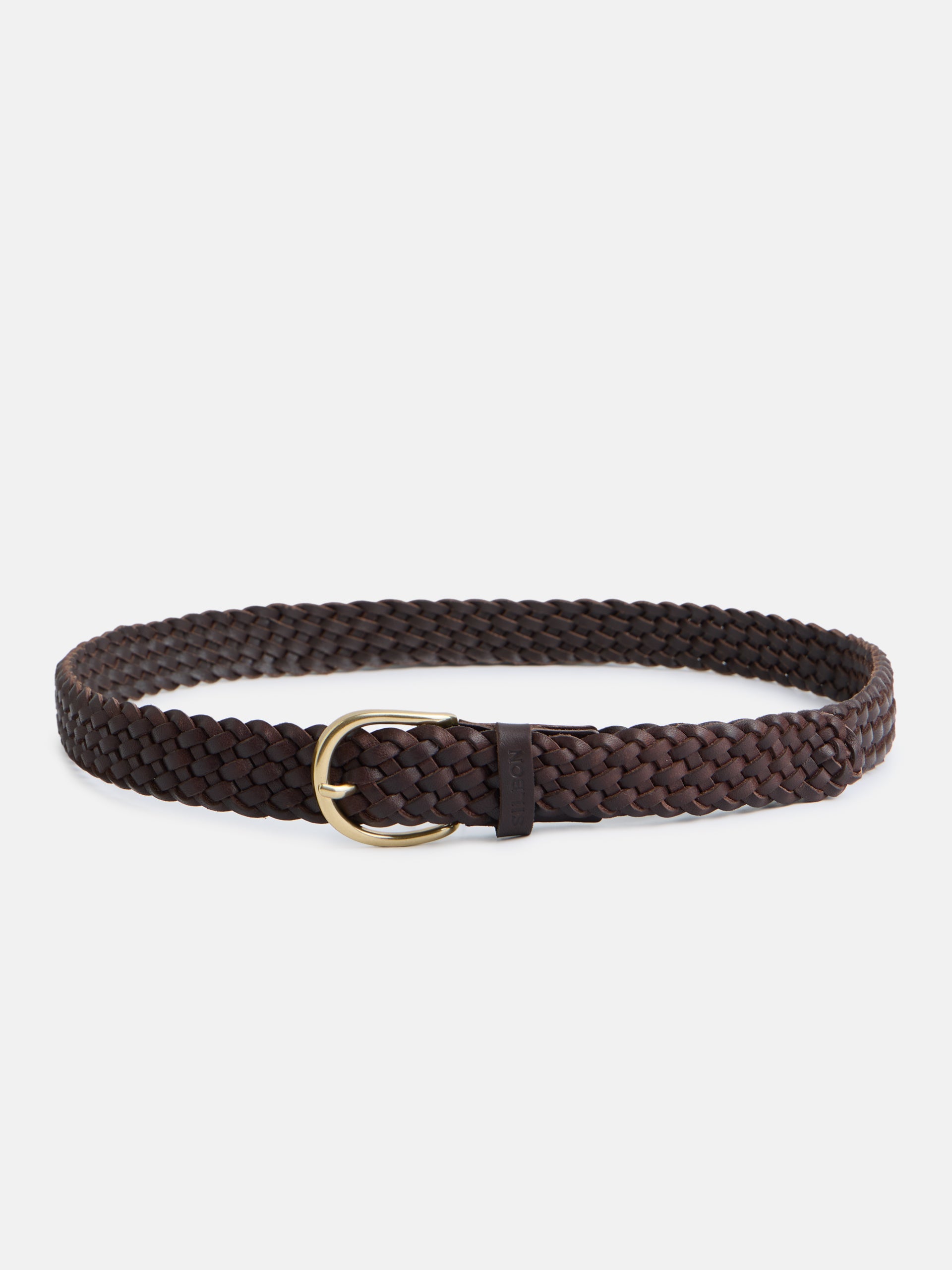 Classic braided leather belt. Features a personalized metal buckle.
