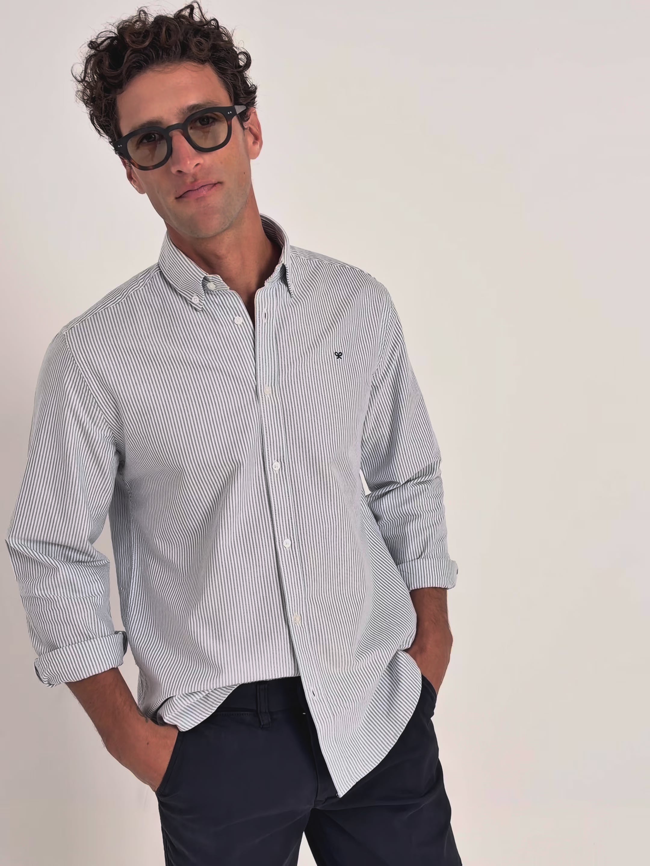Camisa sport oxford de rayas confeccionada en 100% algodón. Presenta cuello button down, cierre con botones personalizados y manga larga de puño con botones. Cuenta con raquetas bordadas a contraste en el torso.