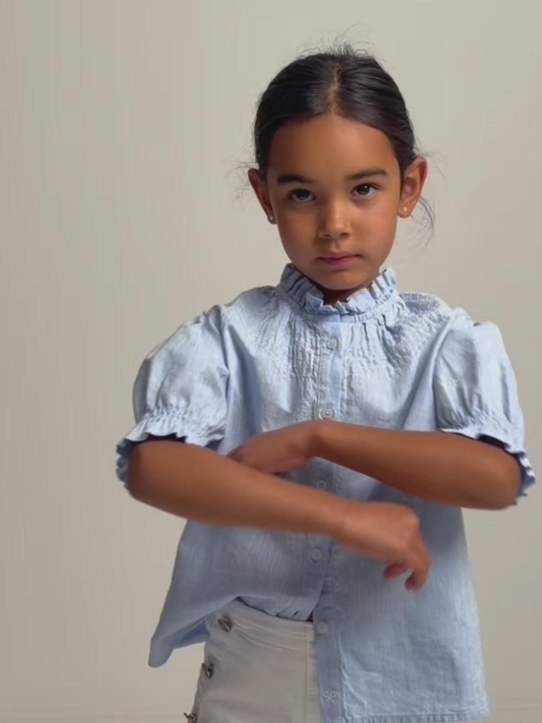 Blusa fruncidos confeccionada en mezcla de lino y algodón. Presenta estilo romántico con detalles de pespuntes bordados en el escote y cuello con volante. Cuenta con manga corta estilo farol con puño ancho y detalle de punto smock con bordados a contraste. Tiene cierre con tapeta y botón camisero personalizado, y bordado de raqueta en tapete inferior. Fabricada en Portugal.