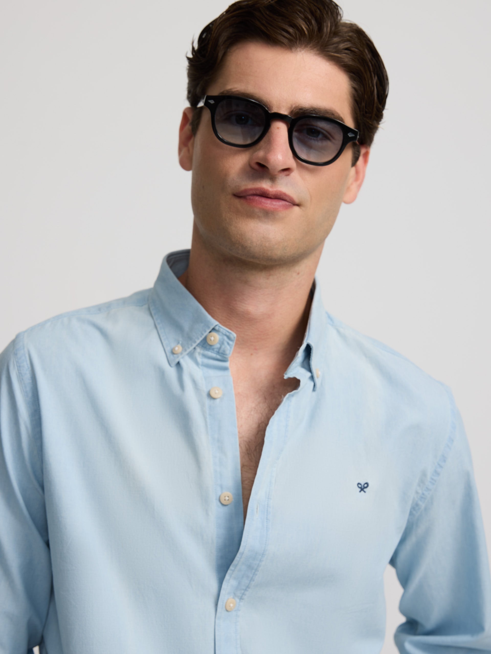 Camisa denim confeccionada en 100% algodón BCI de corte Regular fit. Presenta cuello button down, cierre con botones personalizados y manga larga de puño con botones. Cuenta con raquetas bordadas en el torso.