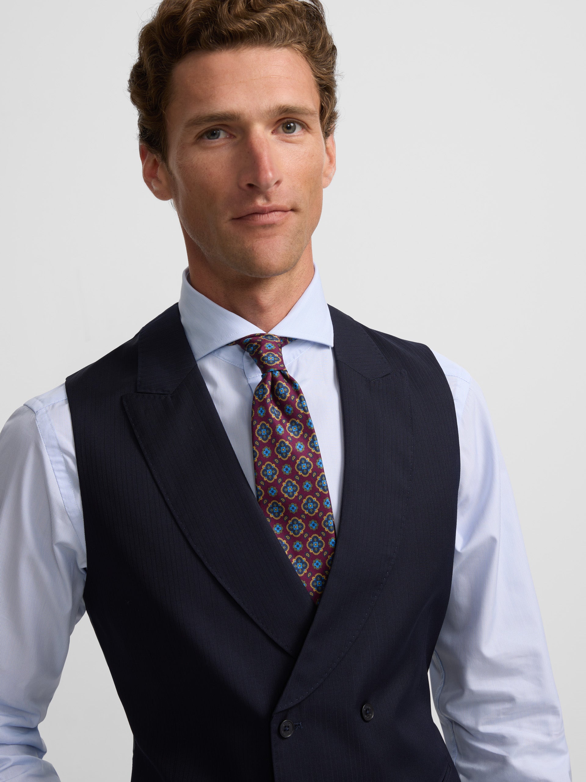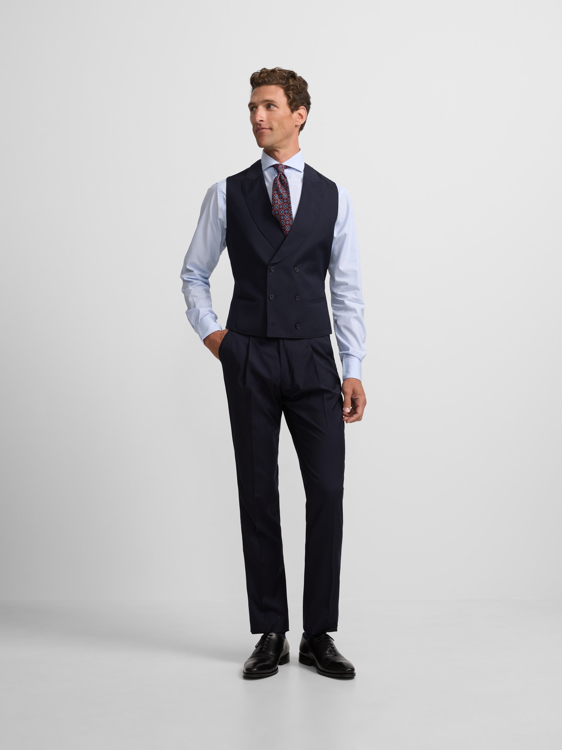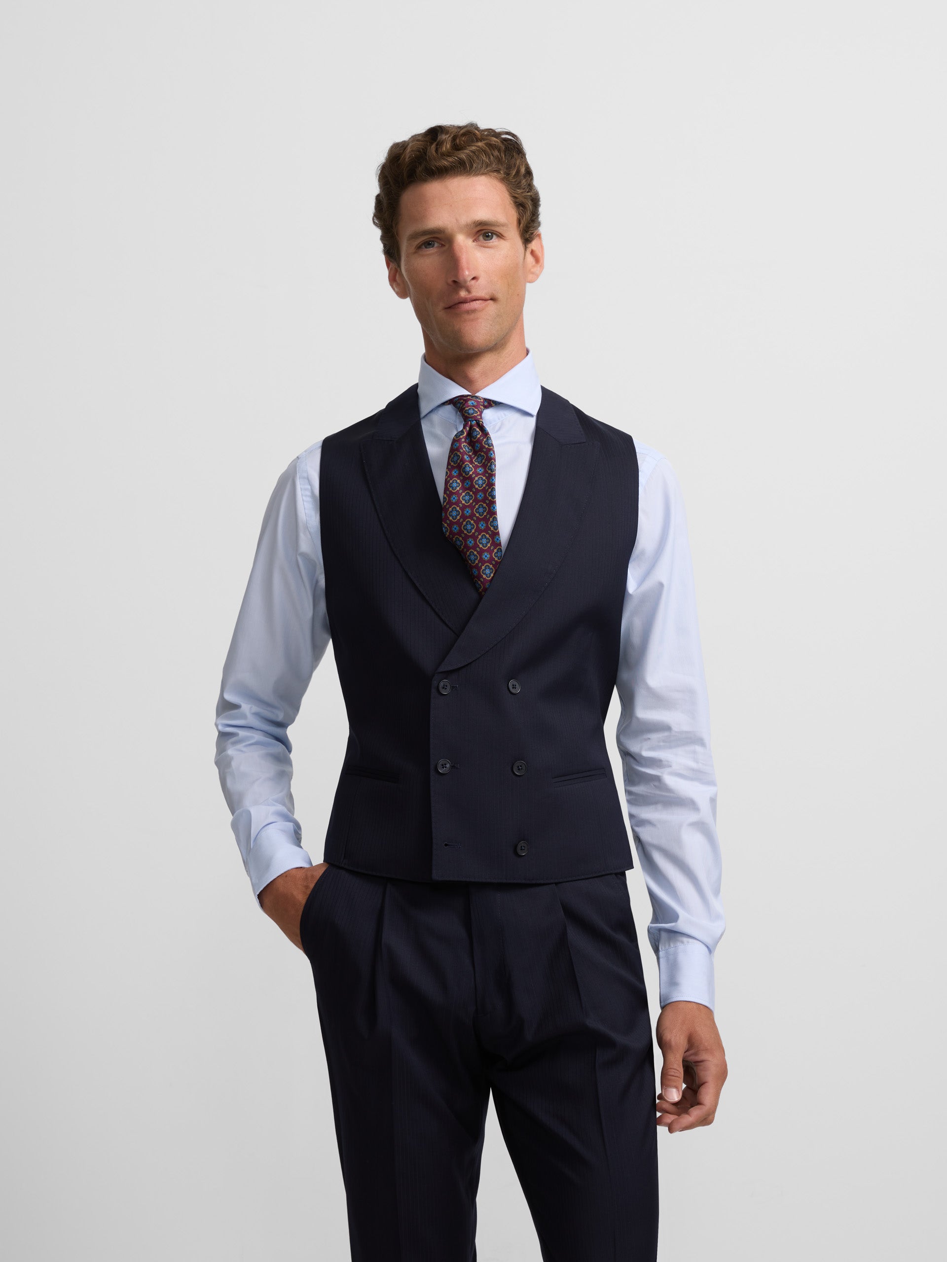 Chaleco de chaqué espiga confeccionado en 100% lana de corte clásico. Presenta forro azul marino con ajustable metálico. Cuenta con solapas de forma redondeada y cierre cruzado con seis botones personalizados. Fabricado en Portugal.