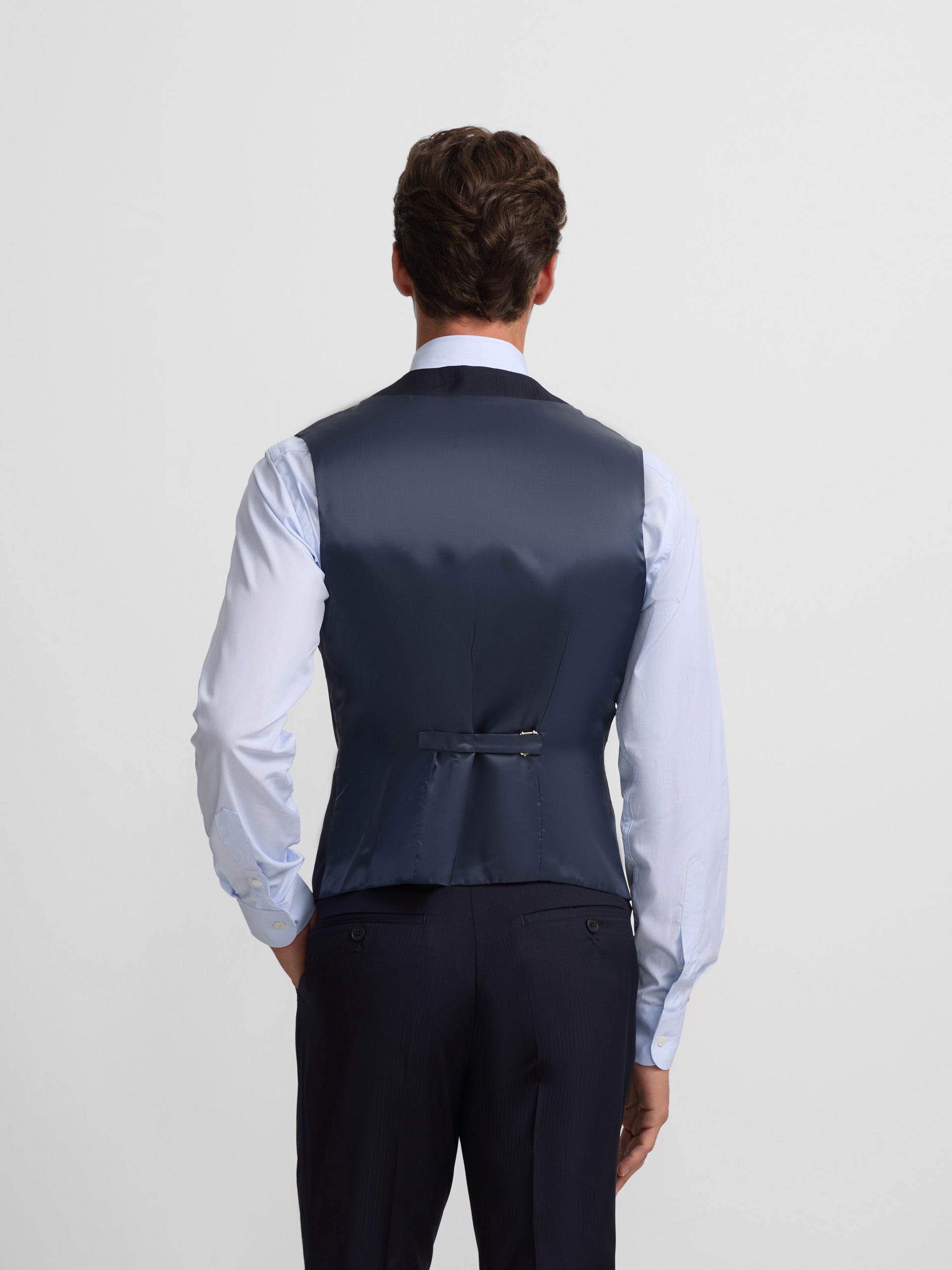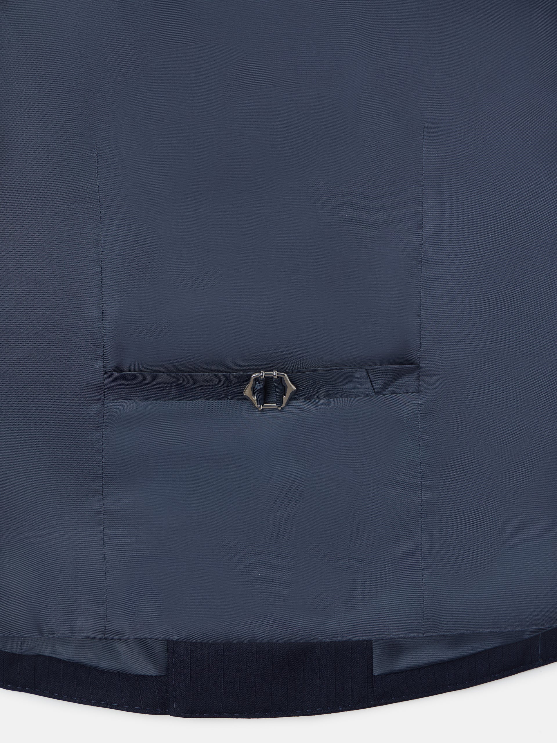 Chaleco de chaqué espiga confeccionado en 100% lana de corte clásico. Presenta forro azul marino con ajustable metálico. Cuenta con solapas de forma redondeada y cierre cruzado con sei .