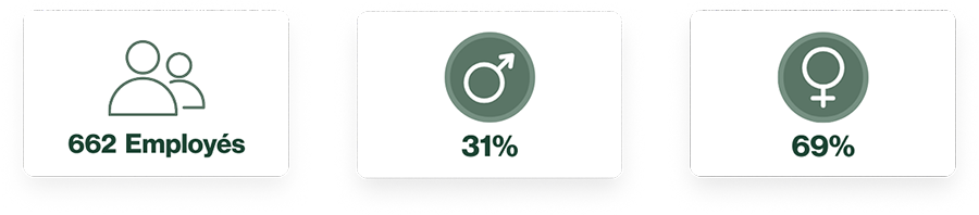 Notre effectif repose sur un modèle fondé sur le talent, la diversité et l’égalité des chances. Nous privilégions également l’emploi stable, l’intégration professionnelle des jeunes et l’insertion des personnes en situation d’exclusion ou de handicap. En 2024, nous avons compté une employée en situation de handicap et collaboré avec un Centre Spécial de Travail afin que cinq personnes en situation de handicap puissent exercer leurs fonctions au sein de notre entreprise.