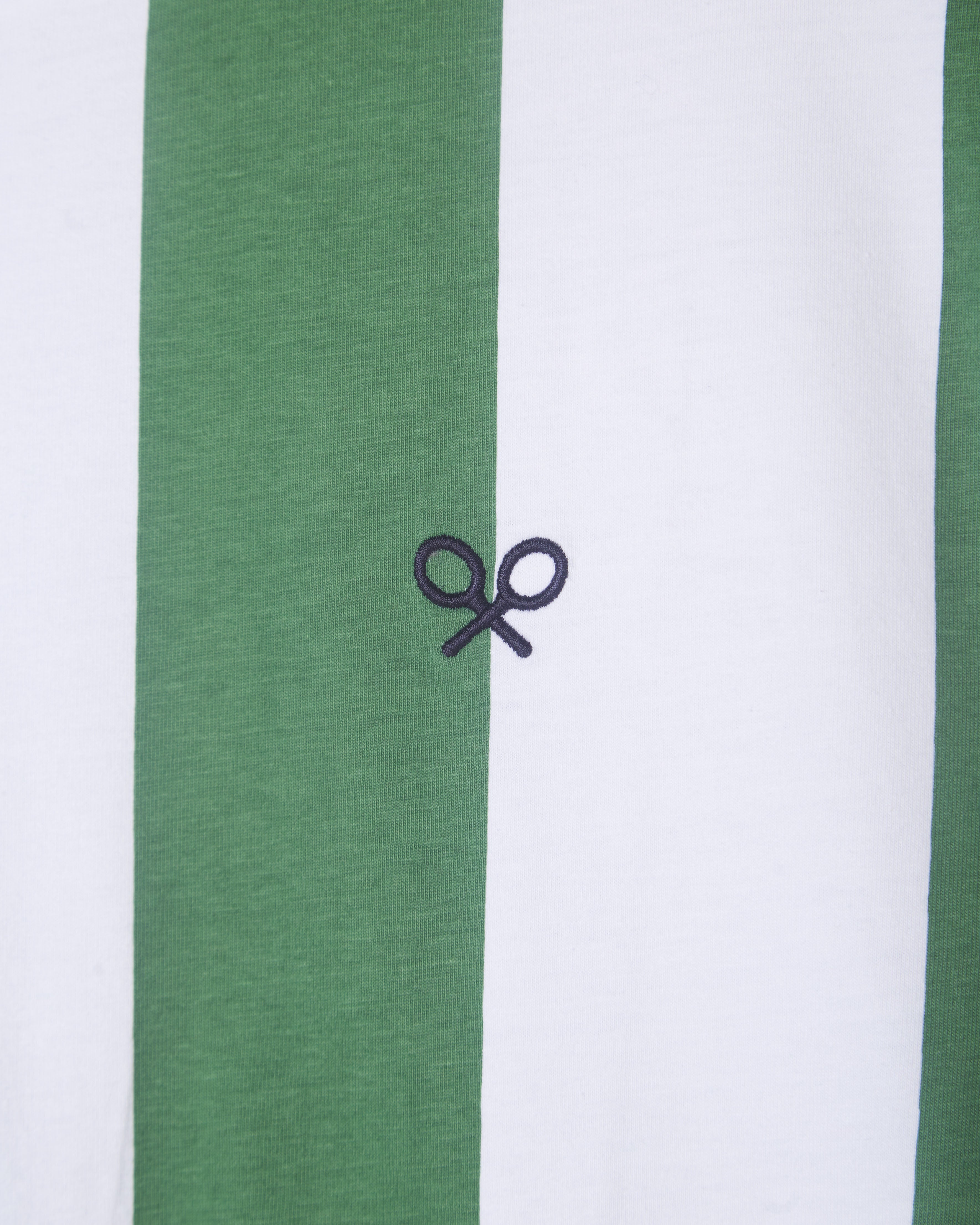 Accompagnez votre équipe avec les maillots du Córdoba Club de futbol. T-shirt rétro à rayures blanches et vertes, 100% coton. Il présente un imprimé raquette sur le torse, un imprimé .