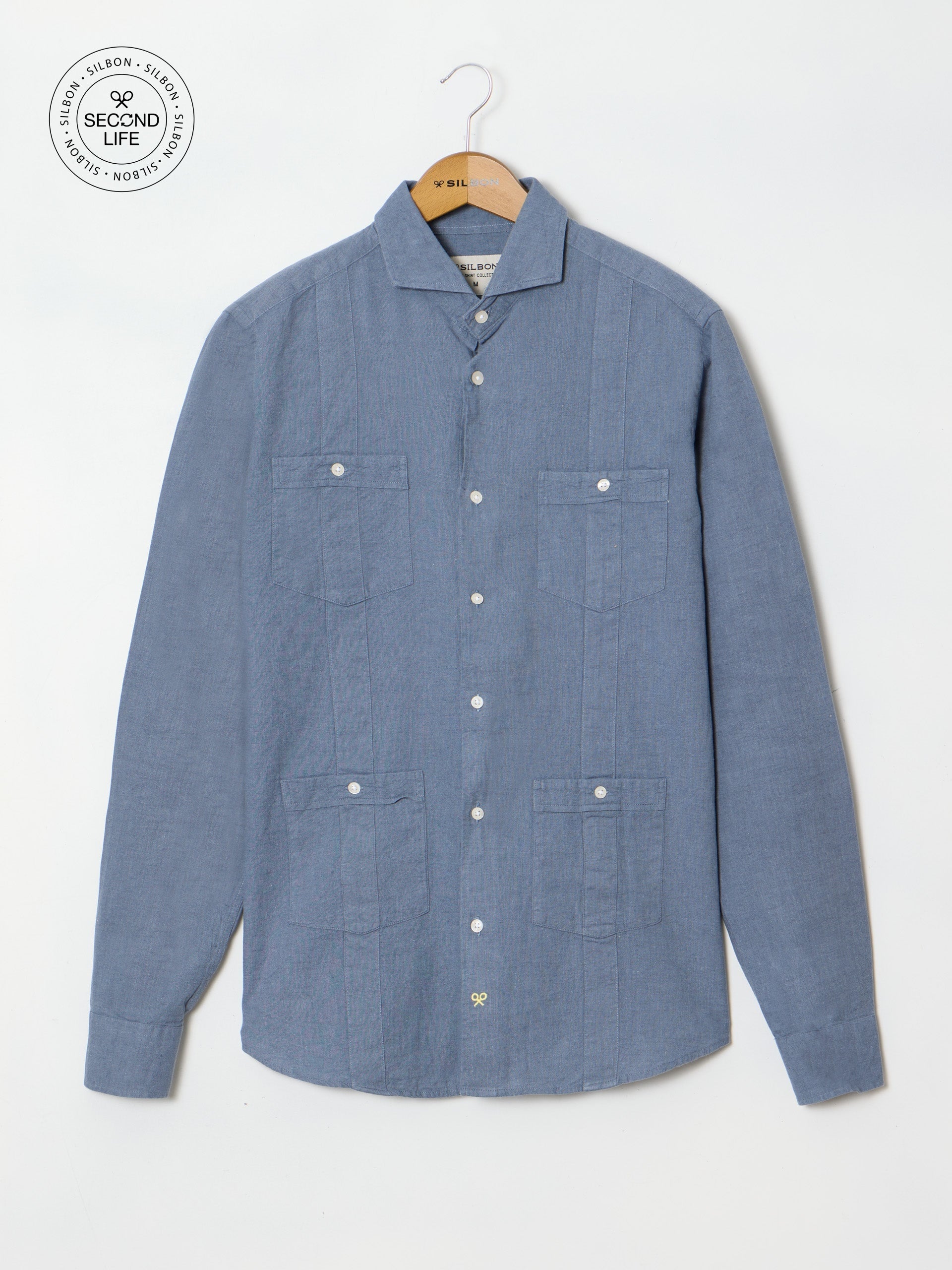 Guayabera de corte Regular fit. Presenta cuello cutaway, bolsillos frontales, cierre con botones personalizados y manga larga de puño con botones. Cuenta con bordado de raquetas en la parte inferior de la tapeta. Los artículos Silbon Second Life son prendas de segunda mano y pueden presentar signos de uso y desgaste. Aconsejamos lavar antes de usar
