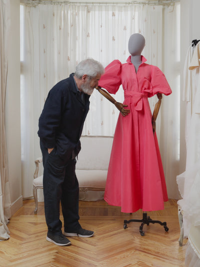 Su estilo se caracteriza por la elegancia clásica, la precisión artesanal y una atención minuciosa al detalle, consolidándolo como una figura clave en la moda española contemporánea.