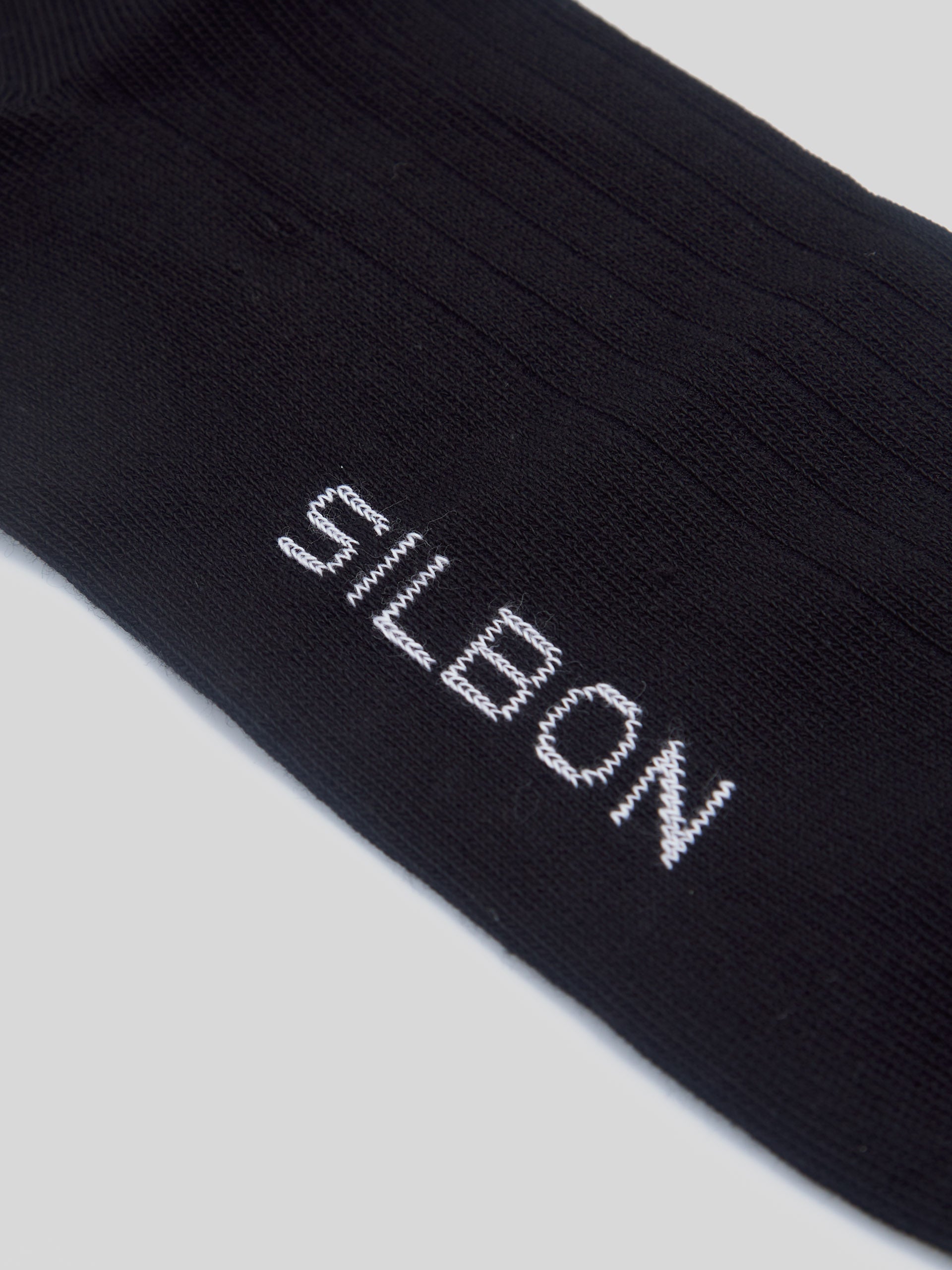 Calcetín tailoring de color negro confeccionado en mezcla de algodón. La caña del calcetín tiene 50 cm de altura. Fabricado en Portugal.