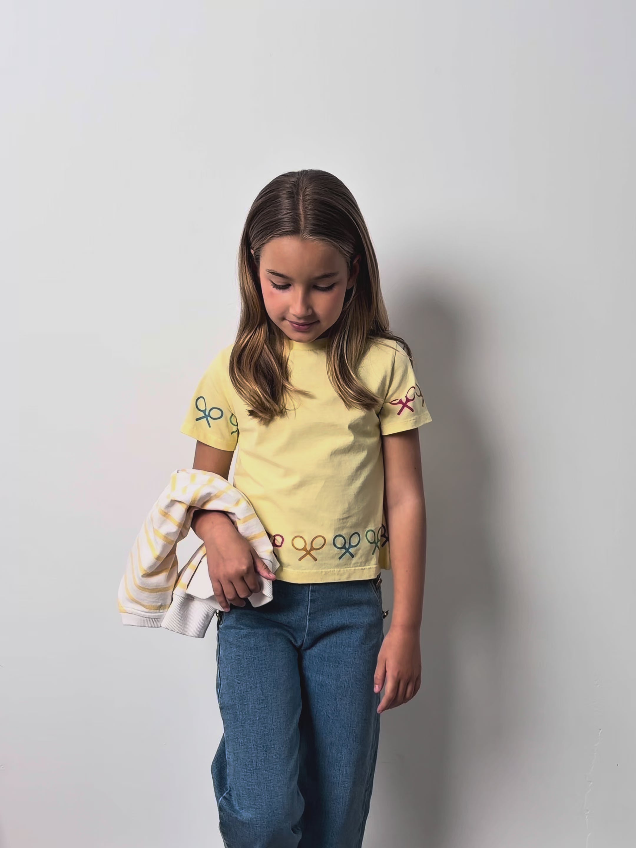 Camiseta girl amarilla confeccionada en 100% algodón. Presenta print de raquetas multicolor en las mangas y en el bajo. Cuenta con cuello redondo y manga corta.