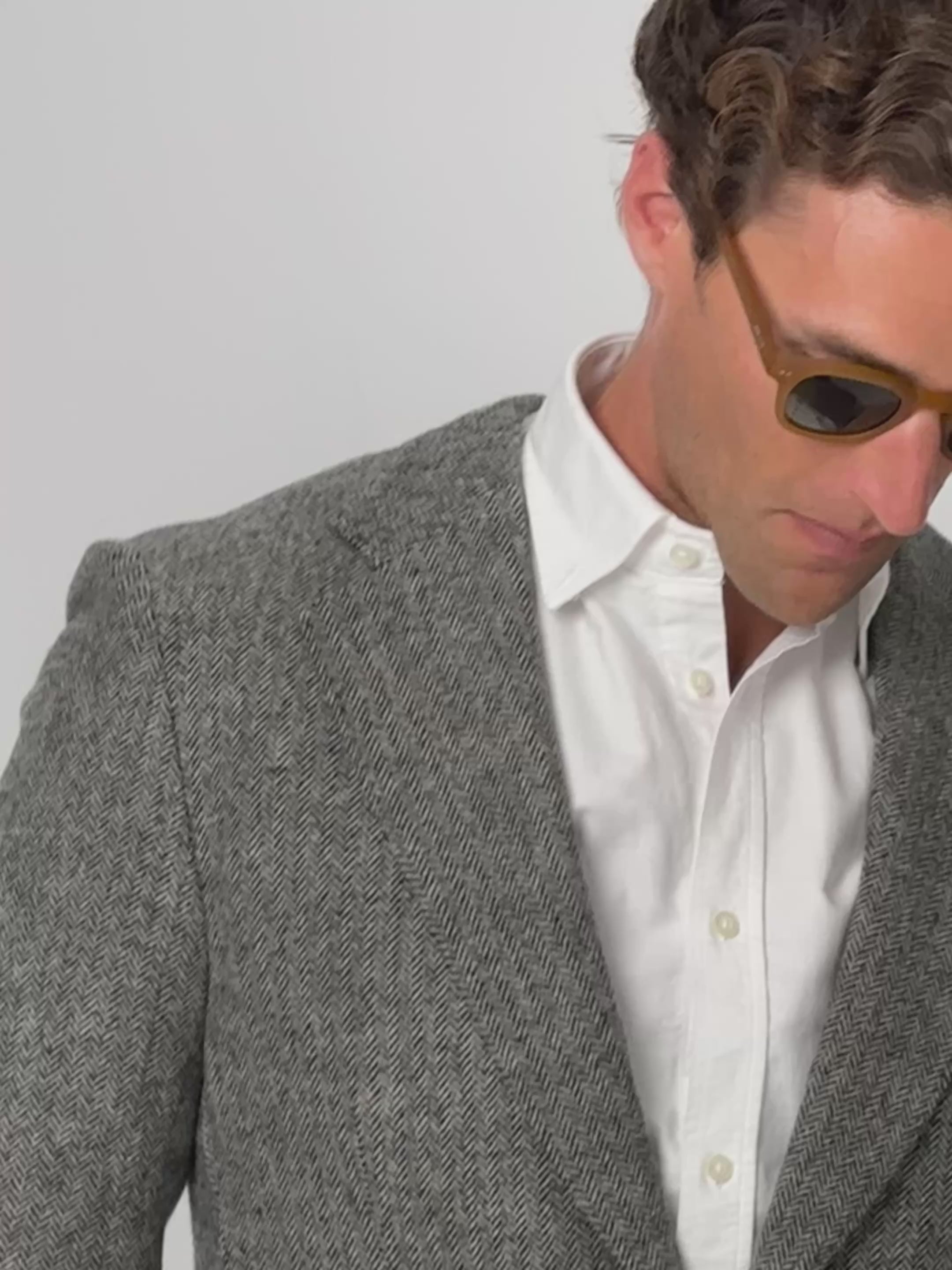 Americana de espiga cor cinza confeccionada em mistura de lã. Apresenta fecho reto com botões personalizados, bolsos frontais de aba, bolso inserido no torso e mangas acabadas com ilhó .