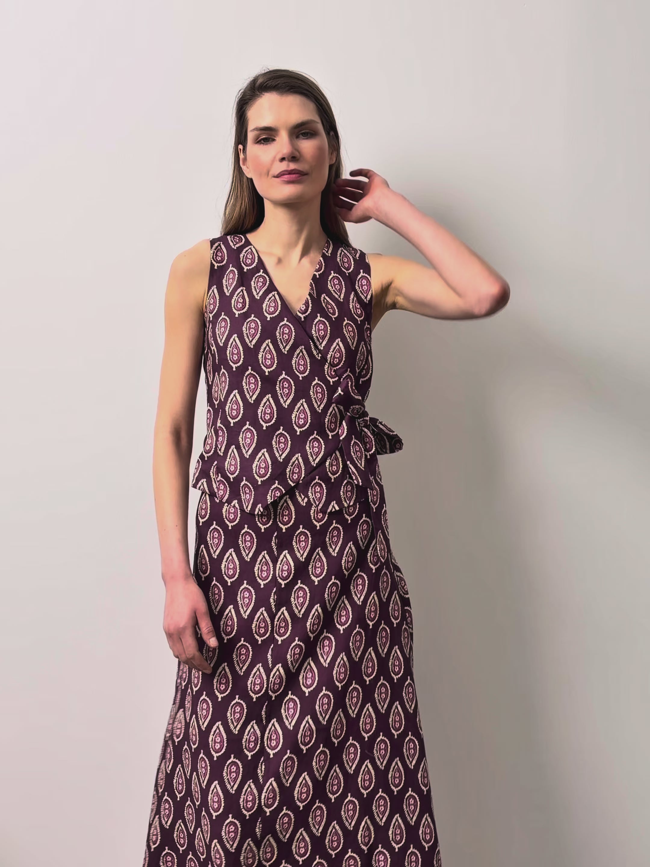 Colete cruzado confeccionado em 100% linho com estampado ikat. Apresenta gola em V e fecho cruzado lateral através de laço do mesmo tecido. Disponível saia a condizer.