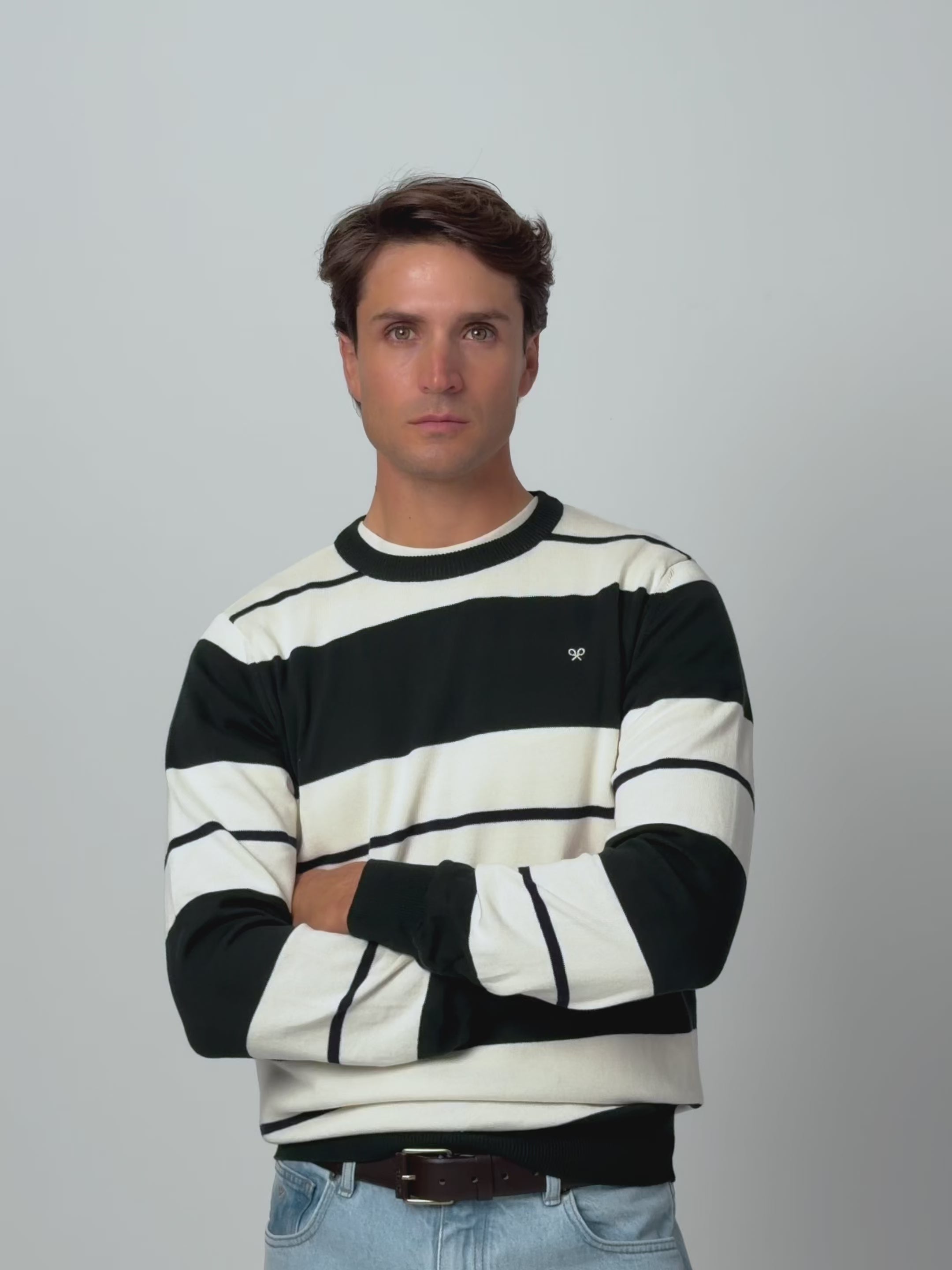 Jersey estampado de rayas largas em tons de verde e creme confeccionado em 100% algodão. Apresenta decote redondo e manga longa. Conta com logo de raquetes bordado no torso. Fabricado em Portugal.