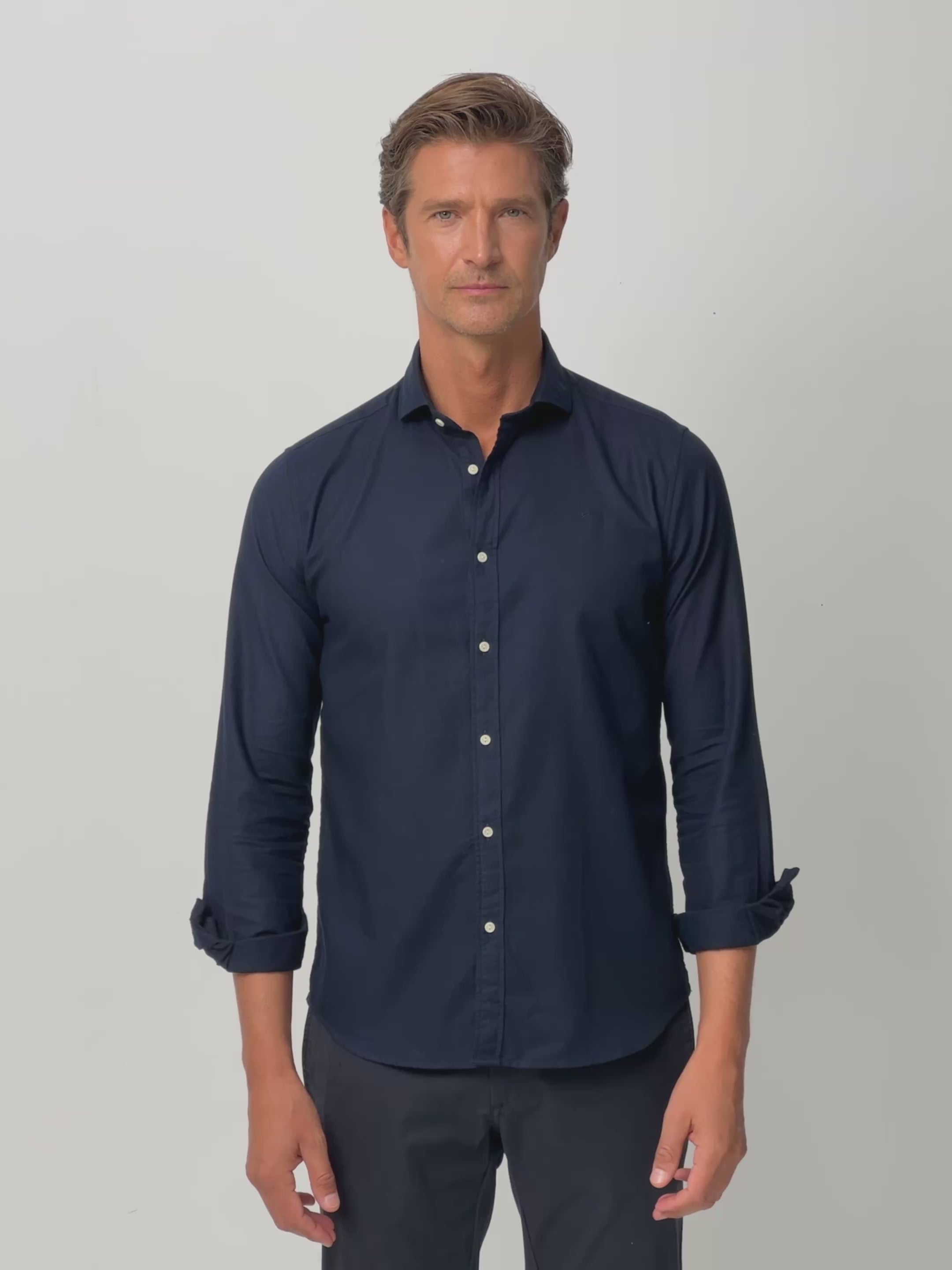 Camisa sport estrutura com tecido em espinha de peixe de cor azul marinho confeccionada em 100% algodão, com corte Slim fit. Apresenta colarinho cutaway e manga longa com punho d .
