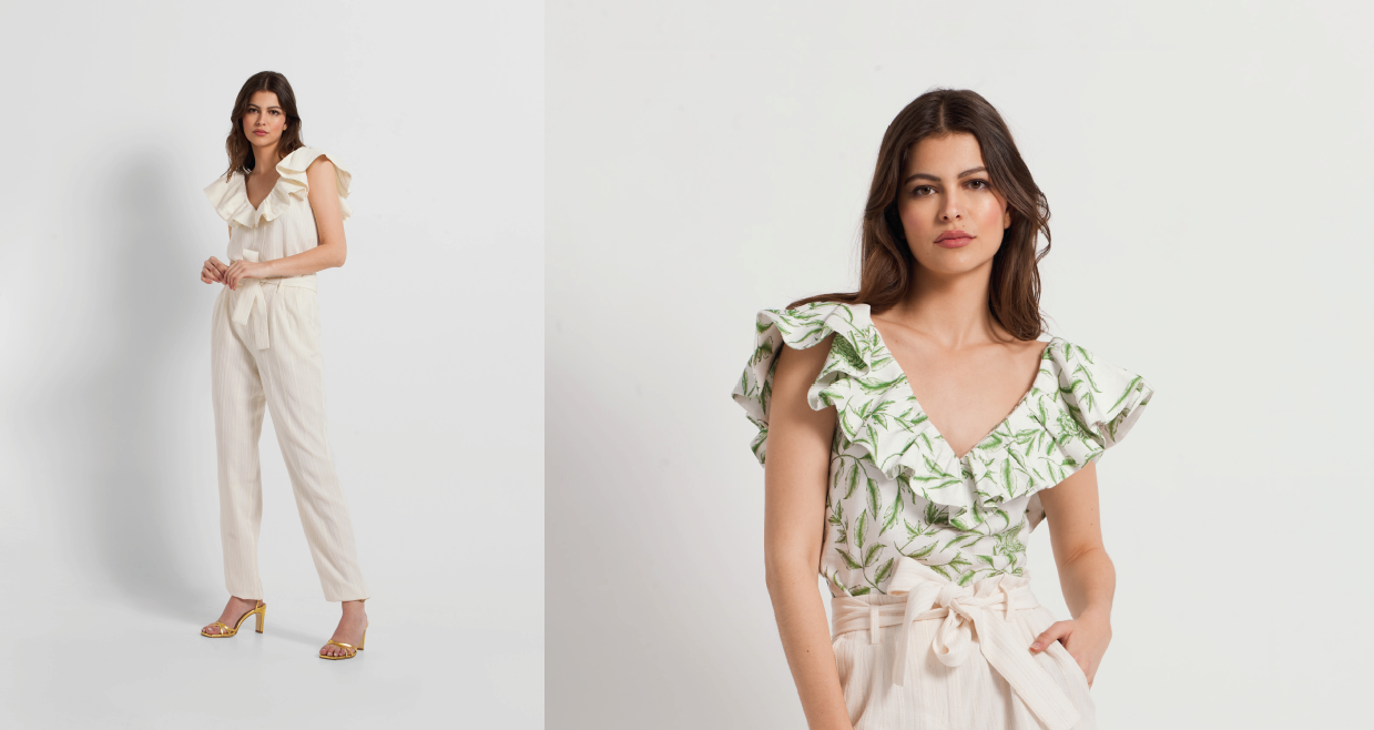 Esta coleção cápsula de Lourdes X SILBON é complementada com um top com o mesmo padrão com volantes, tecido em tons de verde esmeralda e estampado floral do vestido anterior. Uma maneira de combinar a calça com cinto atado com dois tops diferentes para conseguir acabamentos que se adaptam a diversos momentos.